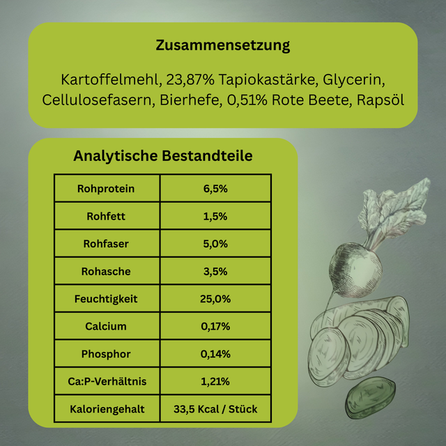 Die enthaltene rote Beete liefert wertvolles Vitamin C und Ballaststoffe, die den Stoffwechsel anregen, die Darmtätigkeit fördern und die Zellerneuerung unterstützen. Tapiokamehl dient als leicht verdauliche Kohlenhydratquelle, die Muskeln und Gelenke stärkt.